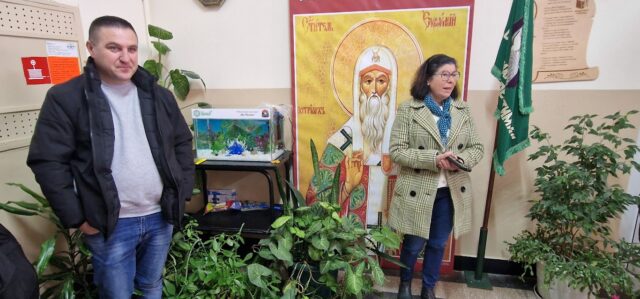 Щастлива съм, че благодарение на дарителите от „Биовет“ и риболовен магазин „При Томито“ нашето фоайе вече има нова придобивка. Тя ще направи нашия жив кът още по-интересен, защото заедно с растенията, които отглеждаме тук ще имаме и живо присъствие с представители на фауната. Всички деца ще се грижат за рибките, защото в нашето училище сме избрали да бъдем добри и да вървим по пътя на доброто. А Доброто е и любов, и привързаност и най-вече обич и правилно отношение към природата.“ – каза Калинка Павлова, директор на ОУ“Св. Патриарх Евтимий“.